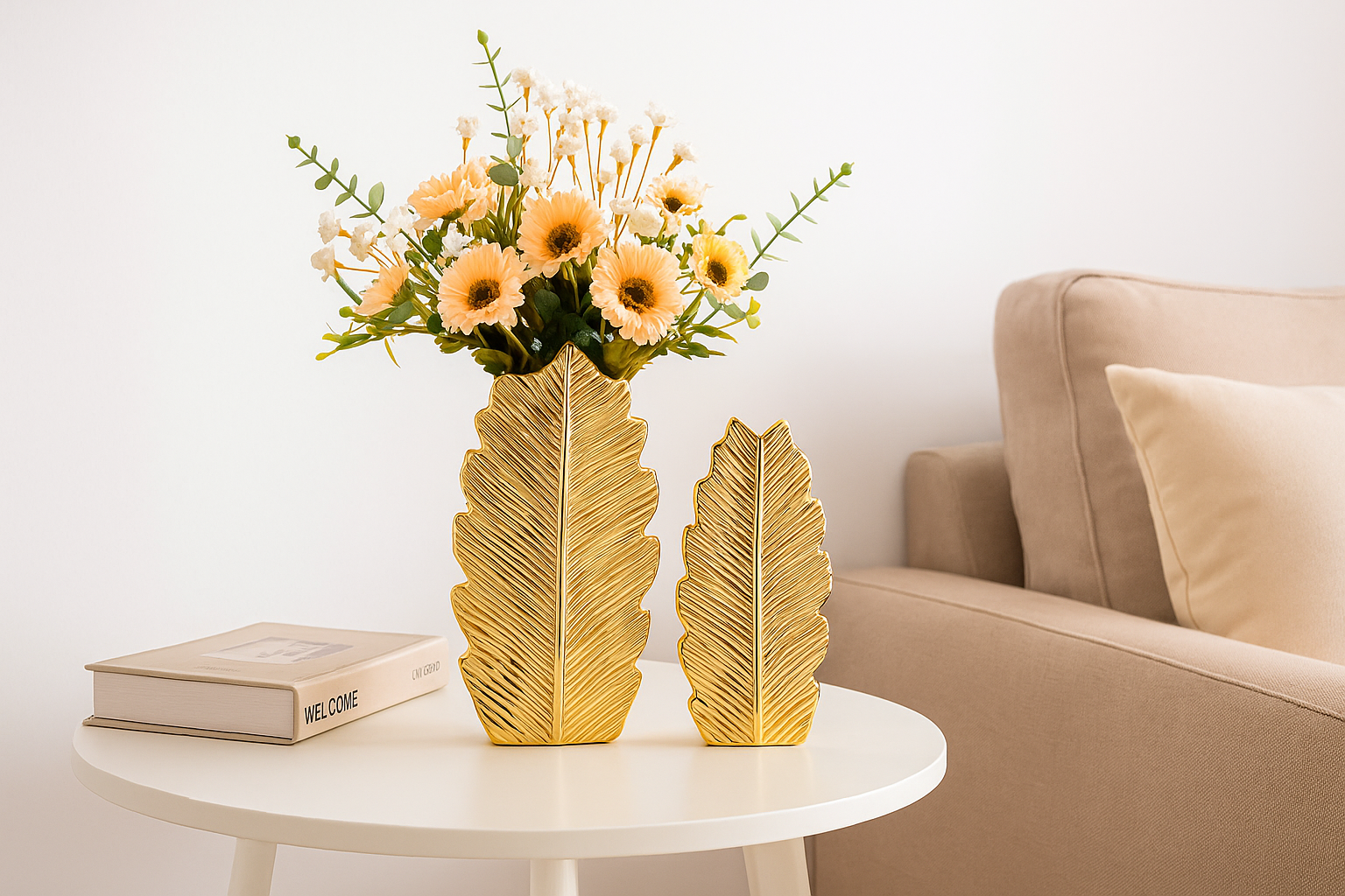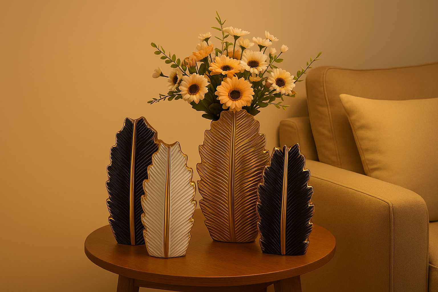 Premium ceramic flower vase in black and golden leaf design – perfect for living room décor, gifting, or as a statement centerpiece.