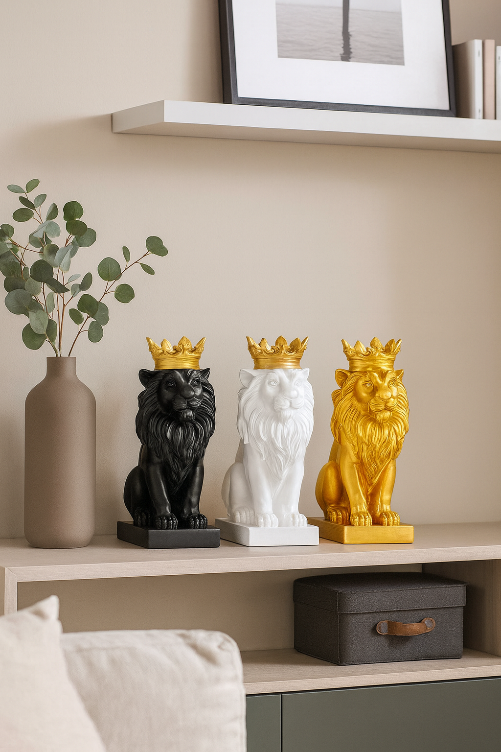 A majestic Decorative King Lion with golden crown, available in black, white, and golden. Perfect centerpiece for living rooms, bedrooms, or office décor.