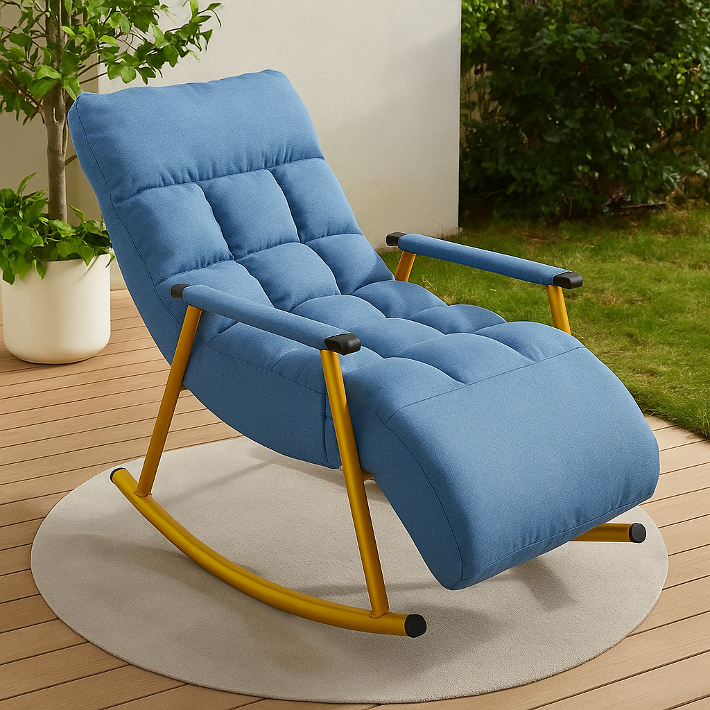 Experience ultimate comfort with the Rocking Relaxation Chair, designed for modern homes. This chair features a plush, high-density cushioned seat paired with a sturdy black metal rocking frame. Whether placed in your living room, bedroom corner, or outdoor balcony, it offers the perfect balance of support and relaxation. Its ergonomic design ensures a soothing rocking motion, making it ideal for reading, lounging, or enjoying your favorite beverage. The deep blue fabric adds a stylish touch to any décor, while the durable frame guarantees long-lasting use. Perfect for domestic users seeking comfort and elegance in their living spaces.