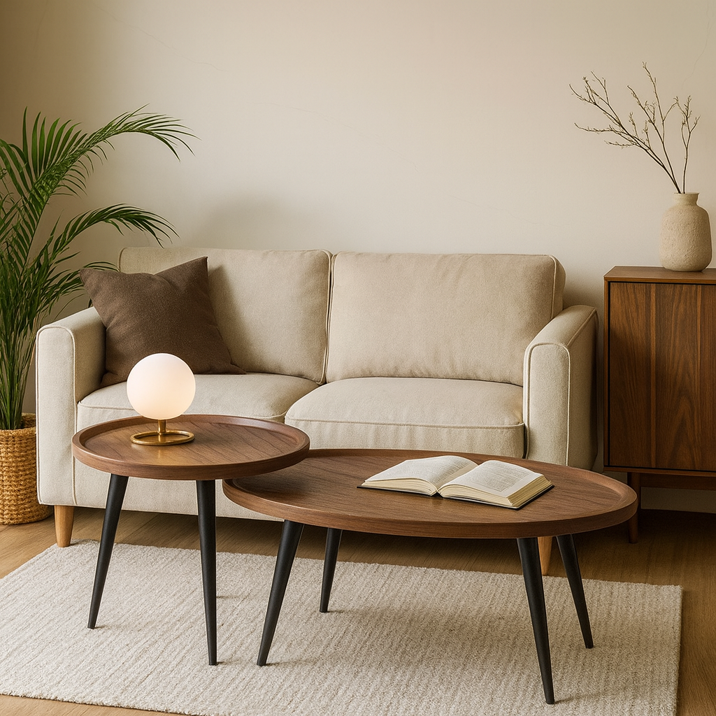 A modern 2-in-1 Centre Table set with brown wooden tops and black legs. Perfect for versatile living room styling with a sleek minimalist design.